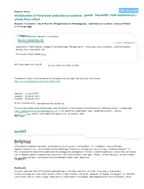 Mientras que se ha investigado ampliamente sobre el bullying y la victimización contra los niños en los países industrializados, esto no se ha ocurrido en las naciones de bajos y medianos ingresos. Este estudio se centró en el bullying u hostilización en el Perú. Se exploró la relación entre la percepción del cuidador sobre la victimización infantil y el punto de vista del niño con respecto a experiencias negativas que ocurren con otros niños de su edad. Asimismo, el estudio analizó la relación entre la victimización y los comportamientos que ponen en riesgo la salud de los adolescentes. Este estudio utilizó datos de 675 niños participantes en la cohorte mayor del Perú de Niños del Milenio. Los niños y los cuidadores fueron entrevistados en 2002, cuando los niños tenían 8 años de edad, y de nuevo en 2009, cuando esos niños cumplían 15 años de edad. Para medir el grado de victimización se recogieron las percepciones de los niños y sus cuidadores, mientras que los indicadores de los comportamientos de riesgo a la salud comprendió el tabaquismo, consumo de alcohol y las relaciones sexuales entre los adolescentes.