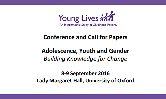 El estudio Niños del Milenio/ Young Lives convoca a la presentación de propuestas de investigación –o afiches– para la conferencia internacional (en inglés) “Adolescencia, juventud y género: generando conocimiento para el cambio” que se realizará el 8 y 9 de septiembre de 2016 en Oxford sobre temas de adolescencia que usen nuestras bases de datos u otras de tipo longitudinal. Pueden postular investigadores, funcionarios públicos u otros profesionales involucrados en dichos temas. La fecha máxima de envío de los resúmenes es hasta el 15 de febrero de 2016. Estos pueden ser de: