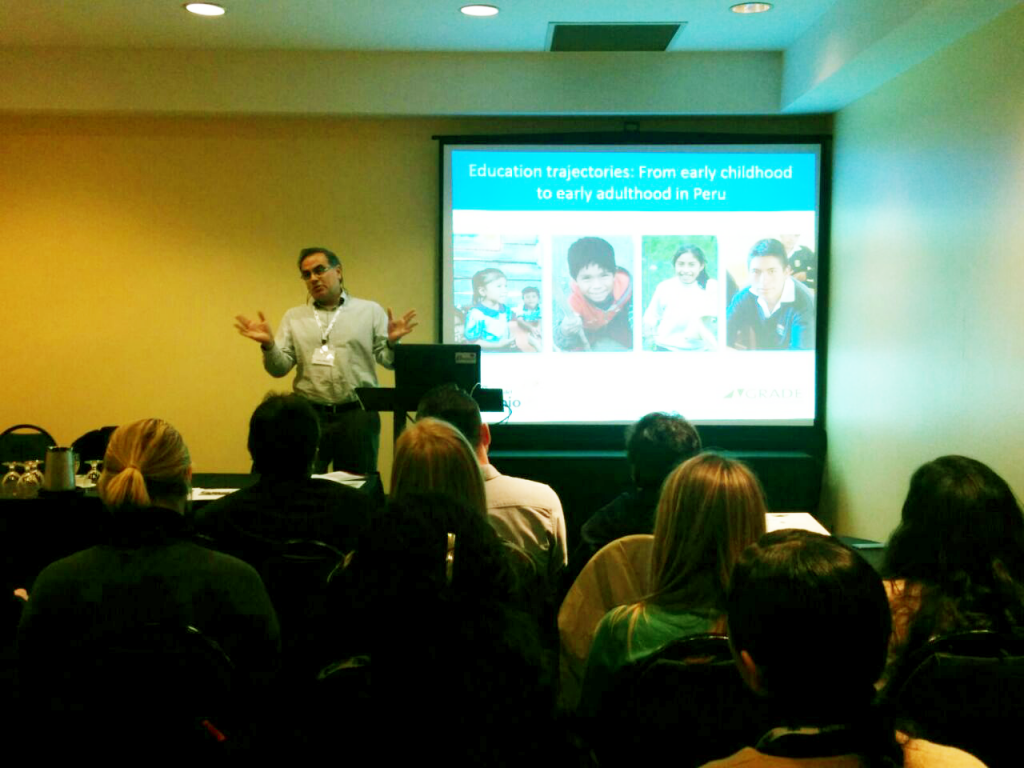 Los expositores del panel de Niños del Milenio –Trayectorias educacionales y resultados en Etiopía, India y Perú: Determinantes e Implicancias– fueron los investigadores Santiago Cueto, Renu Singh y Caine Rolleston, que se presentaron el 9 de marzo. En general, sus trabajos muestran como las características familiares y las circunstancias en la infancia temprana afectan sus resultados educativos en diferentes contextos: en Etiopía, un país de bajos ingresos con muy bajos resultados educativos; en India (Andhra Pradesh), donde los asuntos relativos al género y la privatización de la educación ejercen gran influencia; y en Perú, donde sus altos niveles de inequidad están largamente asociados con pobreza y origen étnico. El Profesor David Baker, de Penn State University lideró el intercambio de ideas del panel. Accede a los resúmenes de dichas investigaciones aquí.