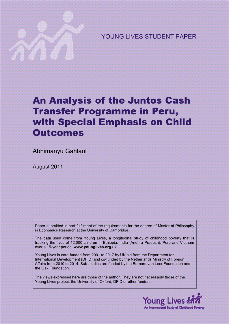 Se halló que el objetivo del programa de atender a los hogares más pobres se ha alcanzado, dado que ellos son sus beneficiarios. Asimismo, el programa parece tener un impacto significativo en la reducción de la incidencia del trabajo infantil. Sin embargo, no se encontró evidencia de que la participación en JUNTOS esté incrementando la matrícula en la escuela puesto que un alto número de niños pertenecientes a los hogares participantes ya se encontraba matriculado antes de la intervención. Finalmente, no se encontró un impacto significativo del programa en indicadores de salud y nutrición como el índice de masa corporal para la edad, y la talla para la edad.